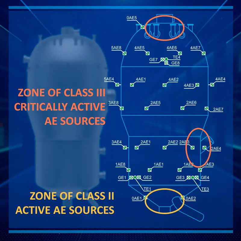 The COMPACS® system provided continuous, round-the-clock monitoring of acoustic emission activity and successfully identified three active areas of concern: at the top of the reactor, at the bottom, and in the area of the catalyst inlet. Thanks to acoustic emission testing, real-time monitoring, early diagnostics, and AI prescriptions: